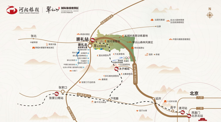 翠云山国际旅游度假区依山傍水而建,紧邻度假区内京张高铁崇礼站,高铁1小时畅达北京,张承高速崇礼北口东行约500米即可到达!