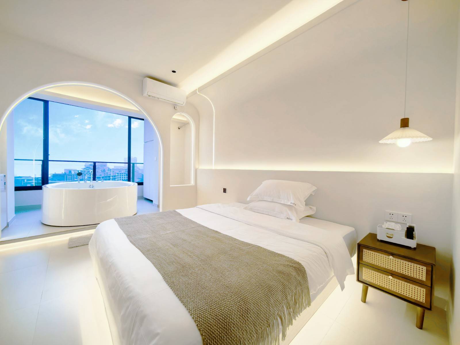 2、房型介绍:1.8米大床侧海景,带大落地浴缸 ,楼层和朝向随机安排(仅供参考),房间基础设施:空调、电视、Wi-Fi、浴室、吹风机、洗漱用品、拖鞋、晾衣架,可选升级双床房,需加收