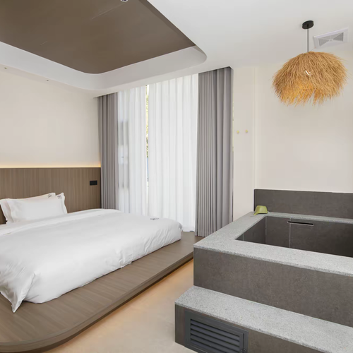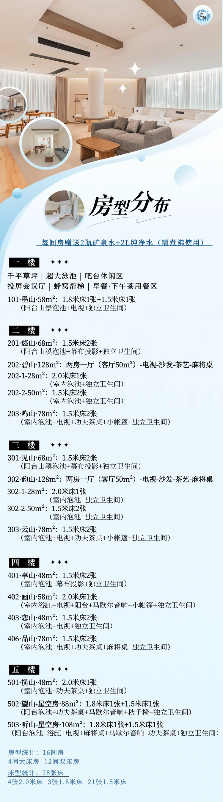 多个房间带独立汤泉泡池民宿一共有16房28床,全部房间都带独立卫生间,其中15间房均设独立泡池,各送两池汤泉,静享专属汤泉时光,舒缓身心,开启惬意之旅。